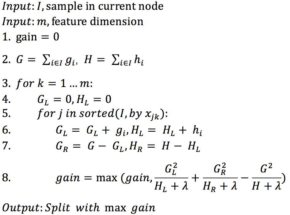 有了目标函数以及分裂增益计算公式,然后就是遍历每一个特征,寻找最佳分裂阈值: