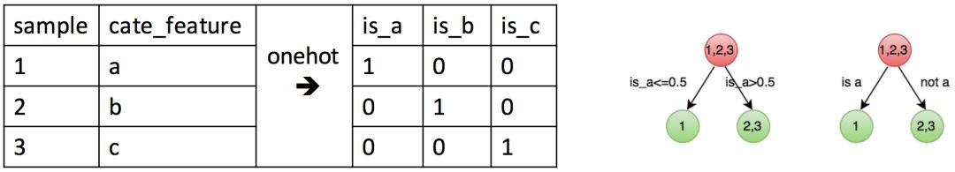 上图表示category特征和onehot之后的特征,右图为onehot之后的分裂以及直接使用category的分裂。
