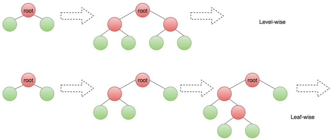 Levelwise是对当前层所有叶子进行分裂,Leafwise则是对当前所有叶子找出分裂增益最大的叶子,然后进行分裂生长。
