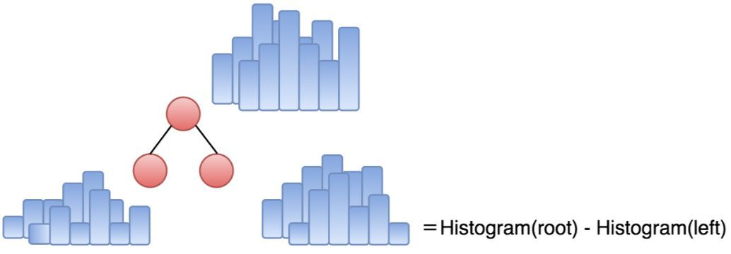 在对一个叶子进行分裂之后,需要重新计算其两个孩子节点的直方图(直方图每一个桶保存的是落到该桶的样本数量、样本一阶导数之和、样本二阶导数之和)。直方图作差如下图所示,指只需要计算样本较少的孩子节点的特征直方图,然后将父节点的特征直方图减去小孩子节点的直方图,就得到大孩子节点的直方图,如此计算只需要遍历小叶子上的样本,从而达到加速的目的。