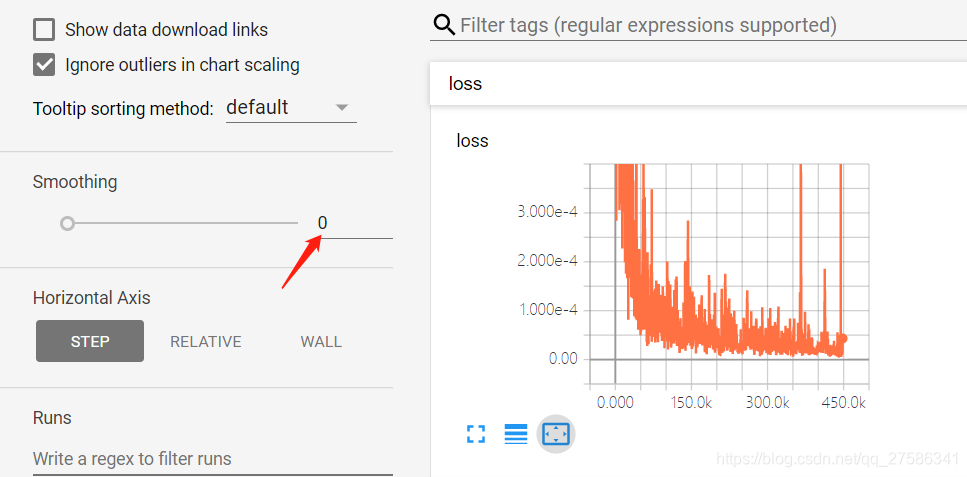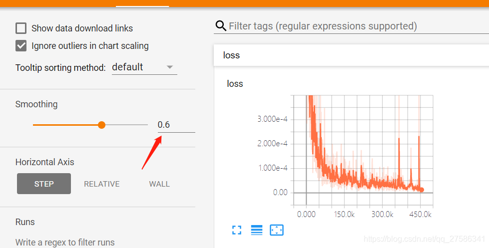 tensorboard左边有一个平滑度数选择,默认是0.6,调节之后曲线就会发生变化,原来颜色浅的才是真实曲线,但真实曲线往往不好看,所以加入了平滑产生了颜色深的线。