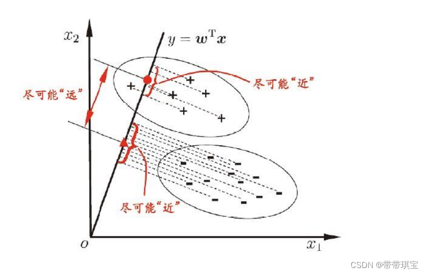 宗旨:找到一条线,使得所有样例的点的映射,使得同类别的点方差最小,不同类别方差最大,而衡量的标准是利用方差和协方差——不同类样例的投影点尽可能远,其矩阵协方差应该越大,而同类投影近,矩阵的方差应该越小