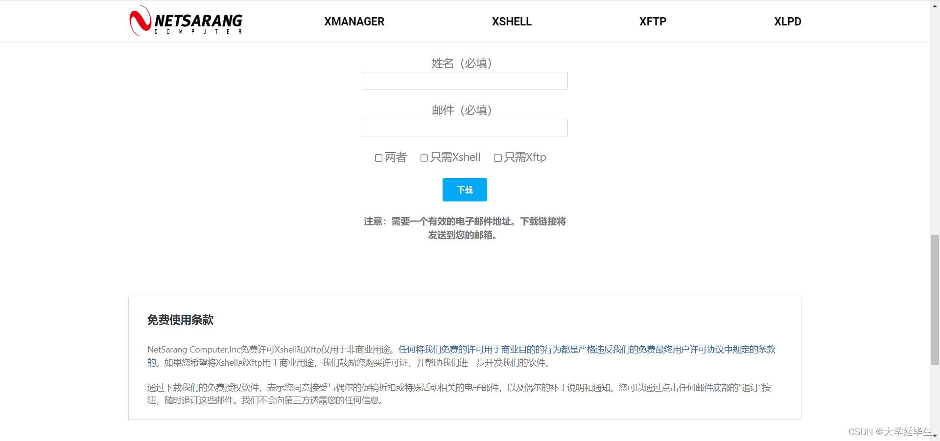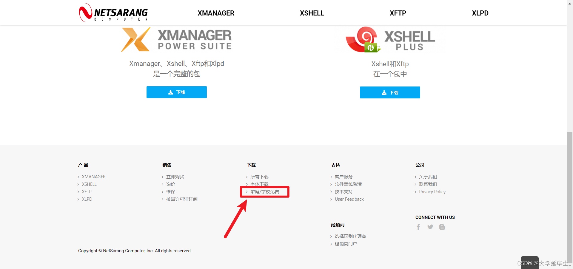 Xshell 与 Xftp 均可在 NETSARANG 官网进行下载,其中企业版需要付费使用,家庭/学校版可以免费使用。网址为:NetSarang Homepage CN - NetSarang Website