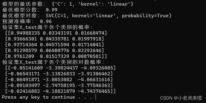 print("验证集X_test属于各个类别的概率:\n",model.predict_proba(X_test)[:5])