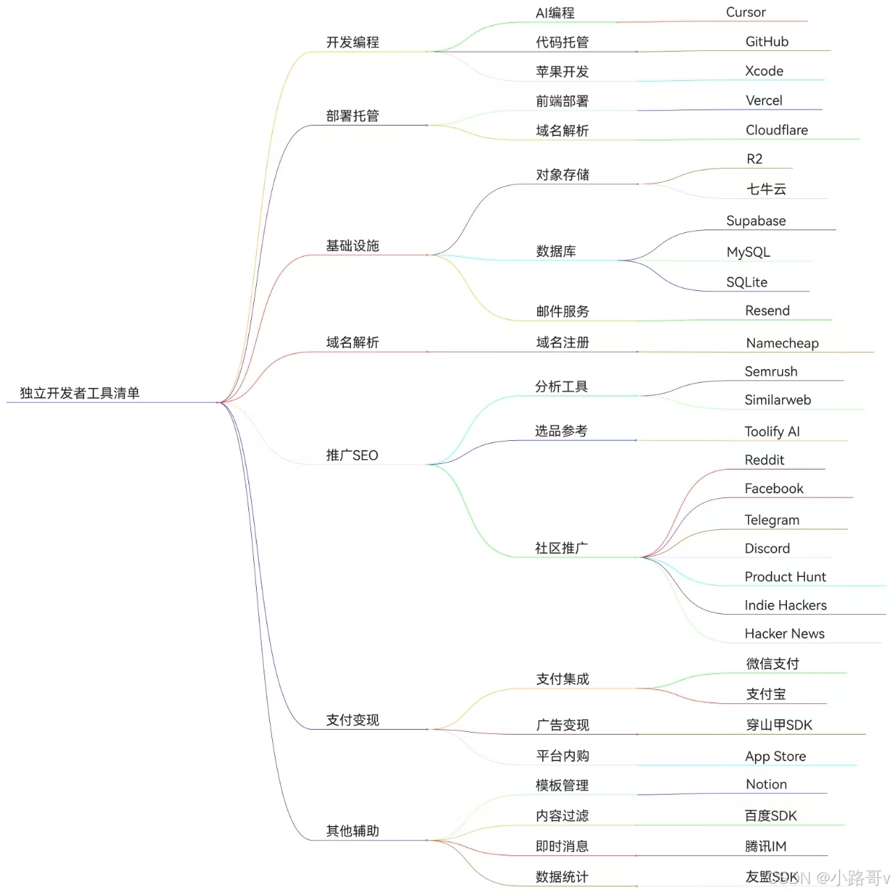 从开发(Cursor、GitHub)、部署(Vercel、Cloudflare)、基础设施(Supabase、MySQL)、推广(SEO工具、社区平台)到变现(支付、广告)。