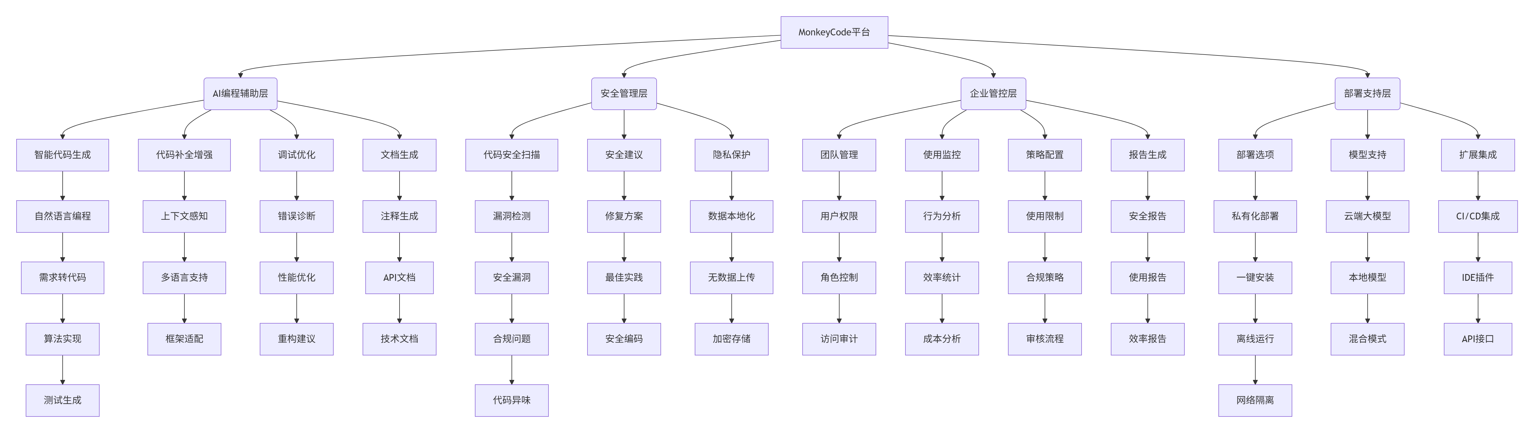 MonkeyCode 是长亭科技推出的企业级智能编程辅助平台,专为注重代码安全和隐私保护的研发团队设计。作为一款支持完全私有化部署的AI编程助手,MonkeyCode不仅提供先进的代码生成和补全功能,还集成了企业级管理面板和代码安全扫描能力,确保在提升开发效率的同时保障代码质量和安全性。该项目基于Roo Code开发,并增强了代码补全和安全扫描功能,为企业提供全方位的编程辅助解决方案。🔗