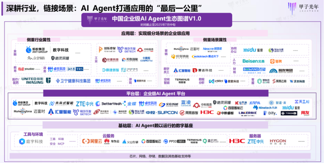 应用层:聚焦特定行业(如金融、工业)或特定场景(如营销、客服),提供直接解决业务问题的Agent应用。