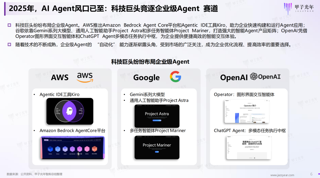报告指出,AI Agent市场尚处早期,格局未定,不同类型的企业正各显身手。从生态图谱可以看出,整个市场形成了清晰的层次结构: