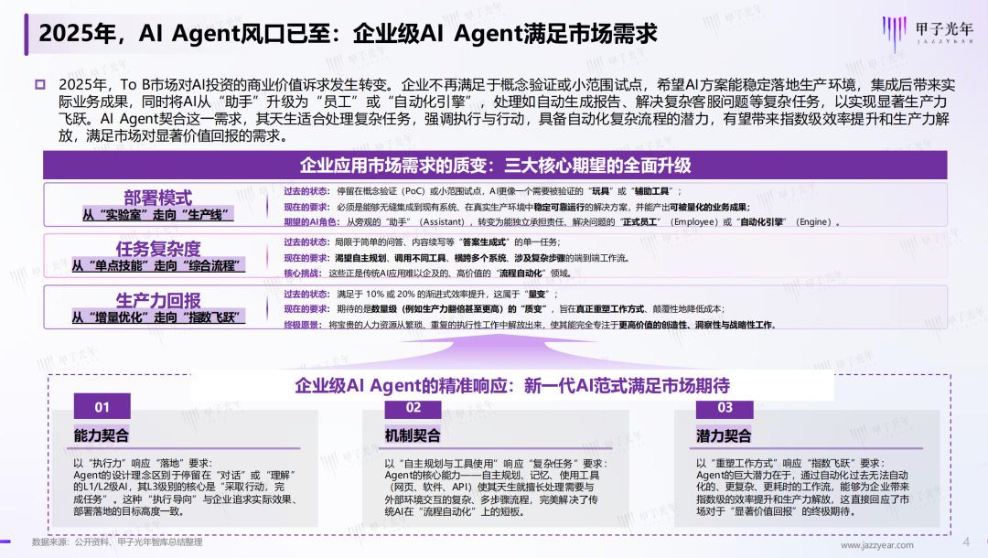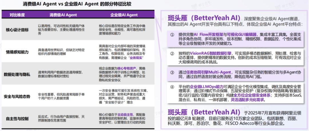 报告指出,企业级应用的核心并非仅是功能强大,更在于其高可靠性、高安全性、可扩展性以及与现有系统的无缝集成能力。消费级Agent追求通用和易用,而企业级Agent则必须深耕“一米宽,百米深”的业务现实,确保在复杂的业务流程和数据环境中稳定、合规地完成任务,真正实现价值交付。