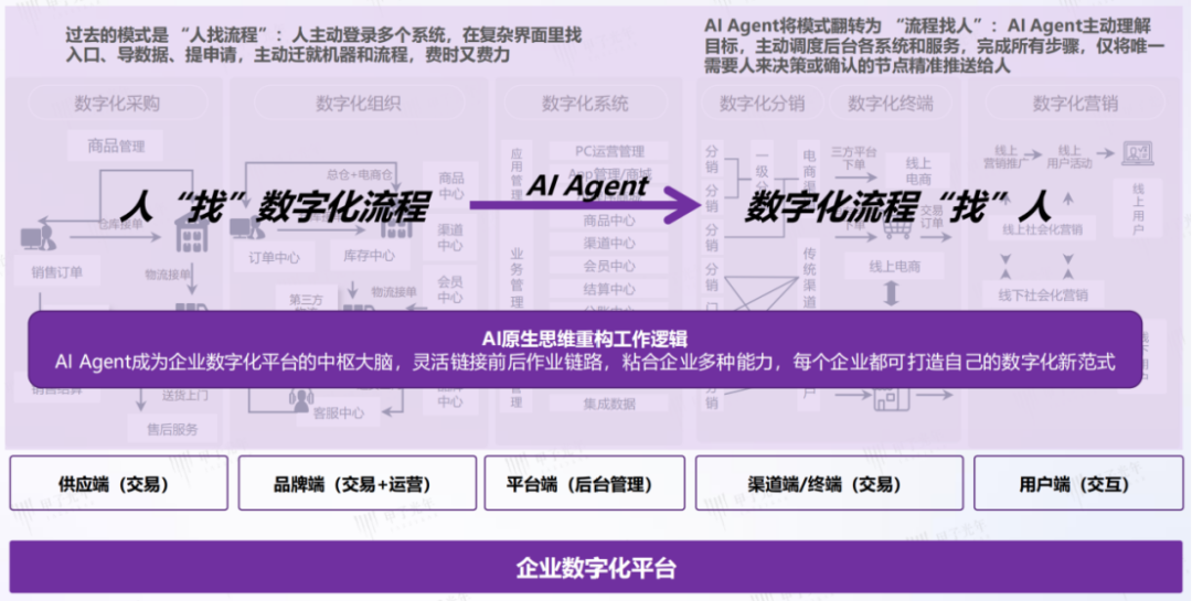 逻辑之变:从“人找流程”到“流程找人”,Agent作为中枢大脑,主动调度后台系统完成任务,仅在关键节点与人交互,将员工从繁琐的系统操作中解放出来。