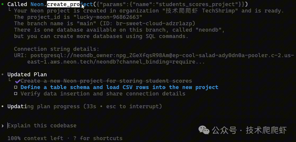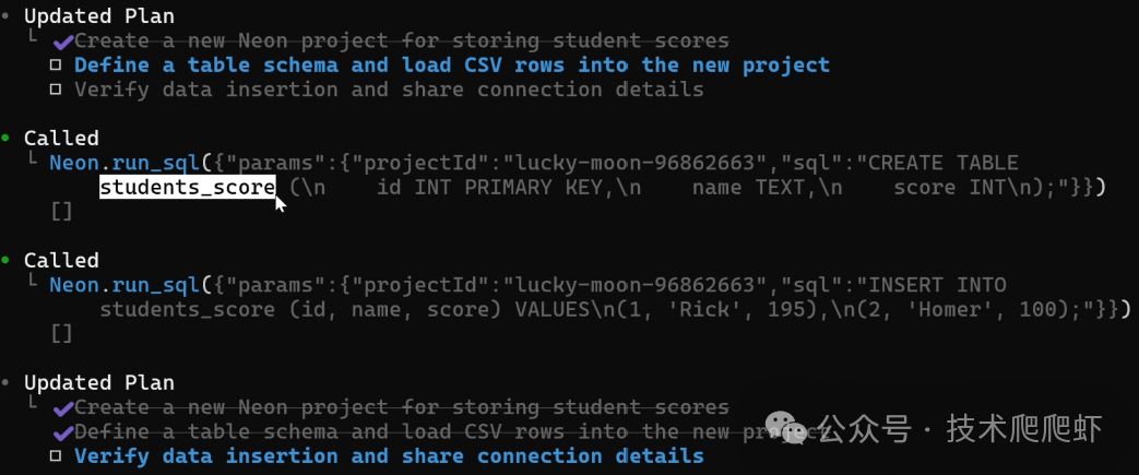 Codex调用了Neon MCP,先新建了一个project,然后执行SQL语句,把表建出来了。