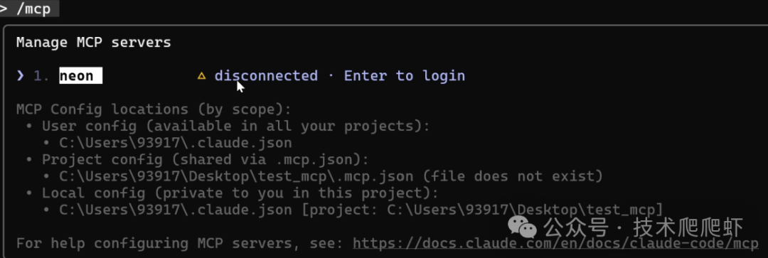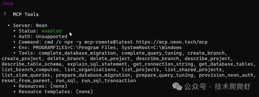 回到Codex,输入命令/mcp,这样Neon MCP在Codex这边也配置完成了。