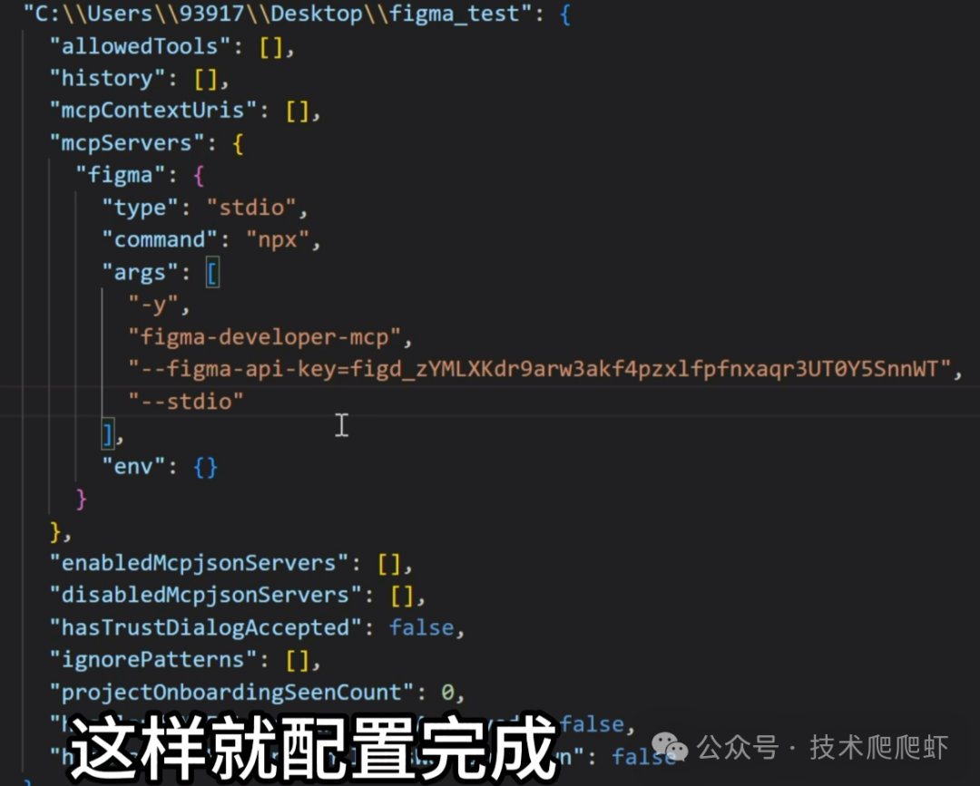 把API Key复制一下,填写到配置文件里面,打个逗号,还有最后一个参数,也就是--stdio。这样就配置完成。