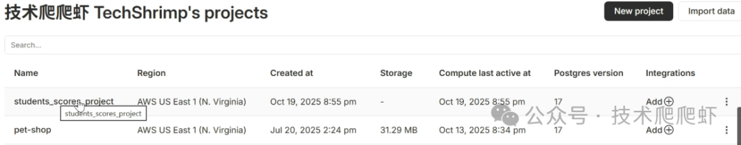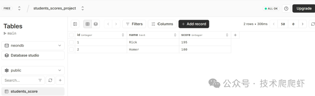 把数据插入了表里面。我们来到Neon的控制台,就可以看到刚才新建的project,在project里面,就可以看到我们的数据表。
