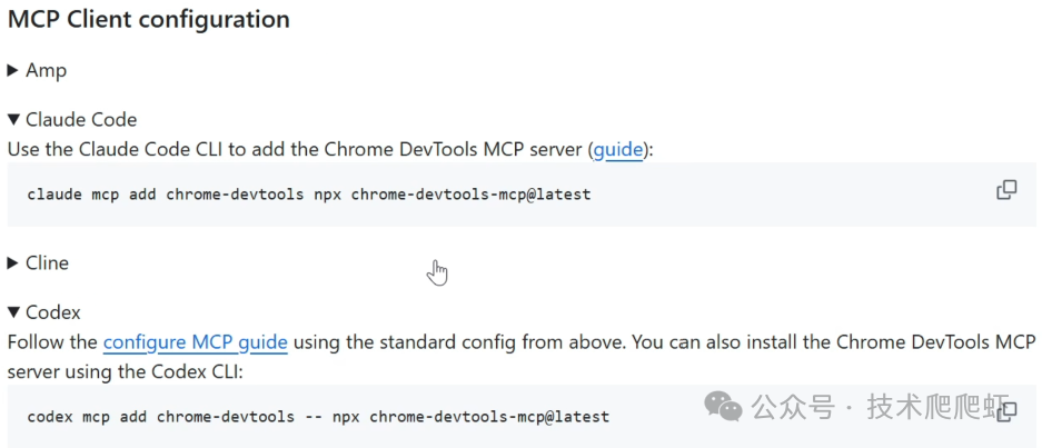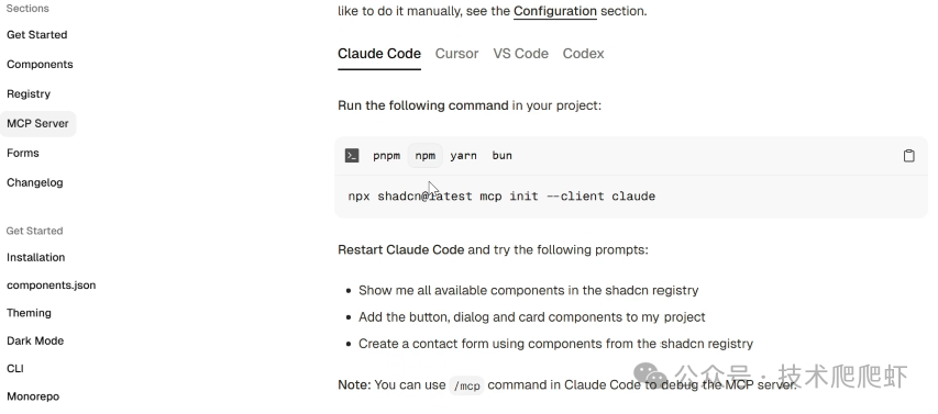 当然我们也可以让AI自动来这边查找,然后把代码给我们复制到项目里面。在左边找到MCP Server,这里面有Claude Code的配置方式。