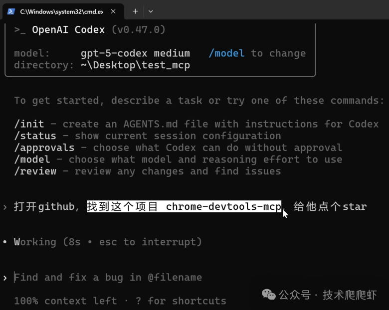 这里我还是回退成Windows,把配置文件保存一下,然后我们还是进入测试文件夹,输入命令Codex,先把Codex启动起来,等待了一会,启动完成,我们输入/mcp,可以看到我们添加的MCP Server,这样在Codex这边就配置完成了。这个MCP的基础用法就是让AI操作浏览器,自动化完成一些操作。我让Codex打开Github,然后找到这个项目,给它点个star。