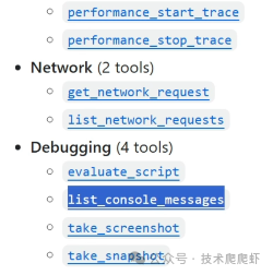 我们看到它调用了MCP工具,打开了Github,找到了搜索栏,然后输入对应的搜索指令,成功搜索到了我们需要的项目,这里也点上了star。除了基础的操作浏览器,它这里面还有一些工具可以帮助我们辅助调试代码,比如可以获取网络请求,然后列出控制台的报错等等。
