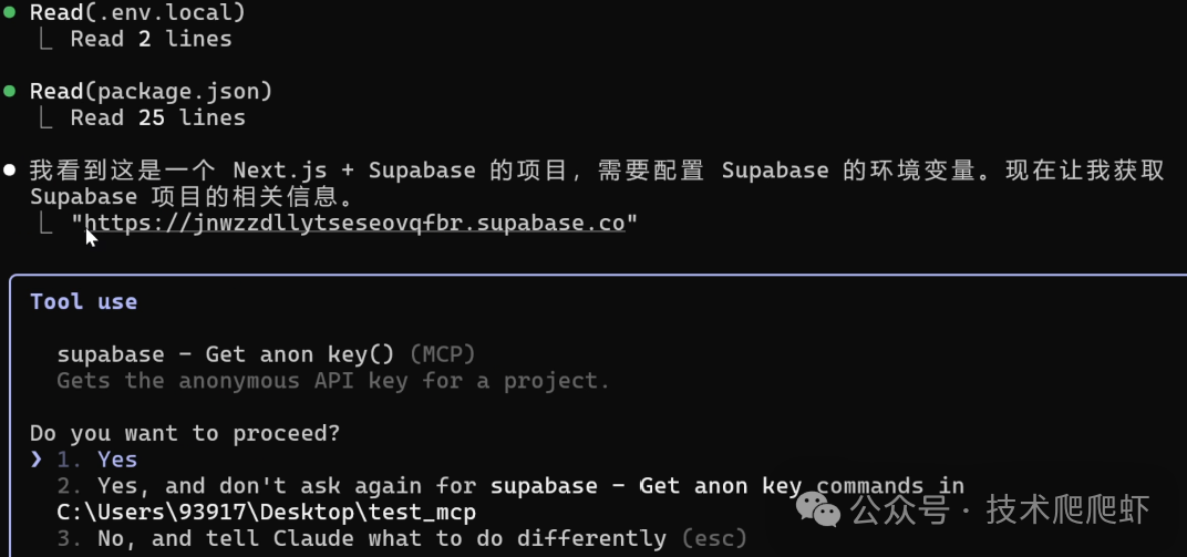 项目里需要配置两个环境变量,一个是URL,还有一个Key。这个完全可以使用MCP自动生成一个。我跟AI说一下,你用MCP把环境变量填一下。这里他成功调用了MCP,帮我们填写好了URL,还有API Key。