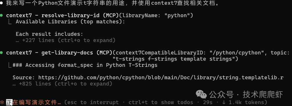 也就是让AI在编码之前,先用context7 MCP查找文档。我们看到AI调用context 7 MCP,成功查找到了一些文档,然后开始编写代码。