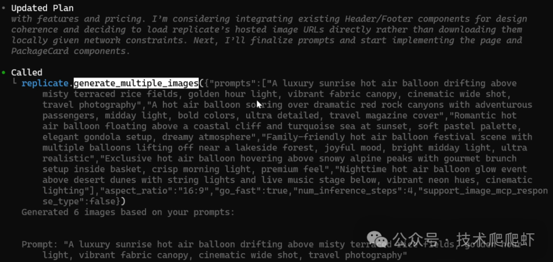 我们来看一个实际案例,给这个热气球网站新建一个销售套餐网页,设计6个套餐可供选择,图片调用Replicate生成,后端可以先不用实现。AI开始编写代码了,这里它调用了Replicate MCP工具,