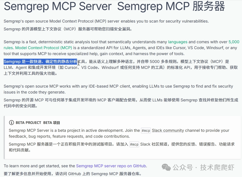 我们可以使用这个MCP Server,把它的安全扫描能力对接给AI,对我们的项目进行一个整体扫描,及时发现漏洞。在文档站这里有一个Github链接,下面有它的配置方式。这也是一个Http的。我们从Claude Code里面配置一下,