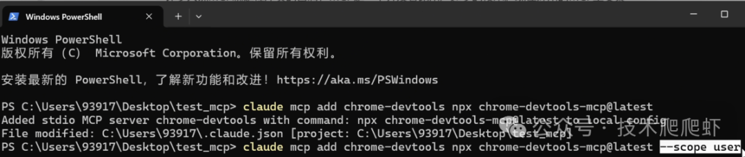 它默认是项目级别的,只对当前这个项目生效;如果想对所有的项目生效,可以在后面加两个--scope user,添加了这个参数以后,这个MCP就变成了用户级,这个电脑上的所有项目都会生效。