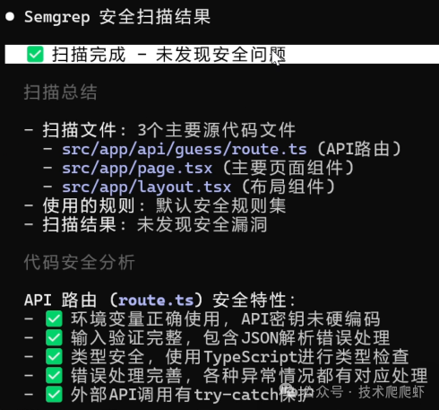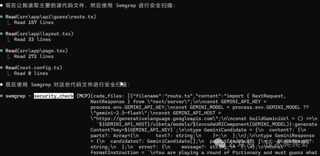 我让他用这个MCP对代码进行安全扫描。我们看到AI调用了MCP工具,对代码进行静态的安全扫描。