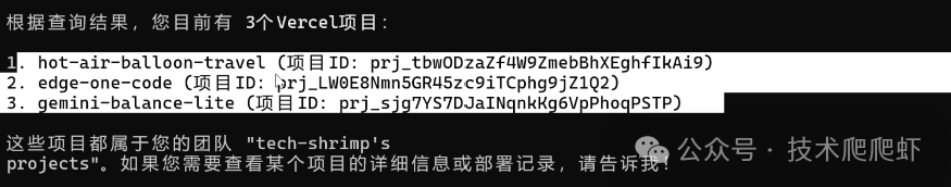 页面都成功显示出来了,部署完成。除了部署项目Vercel MCP,还可以用来查找信息。比如我问他我有哪些Vercel项目,他先调用MCP工具,获取到我的团队信息,然后查找这个团队下面所有的项目,最终查找到了这三个项目,是完全正确的。
