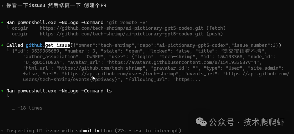 然后代码是在Github上面的,这时候可能下载到我这套代码的人会在上面提一个issue。有人会提交issue,说提交按钮看不清楚。然后我们就可以让AI结合Github MCP自动把这个问题修复。我的提示词是你看一下issue3,然后自动修复一下,创建一个pull request。