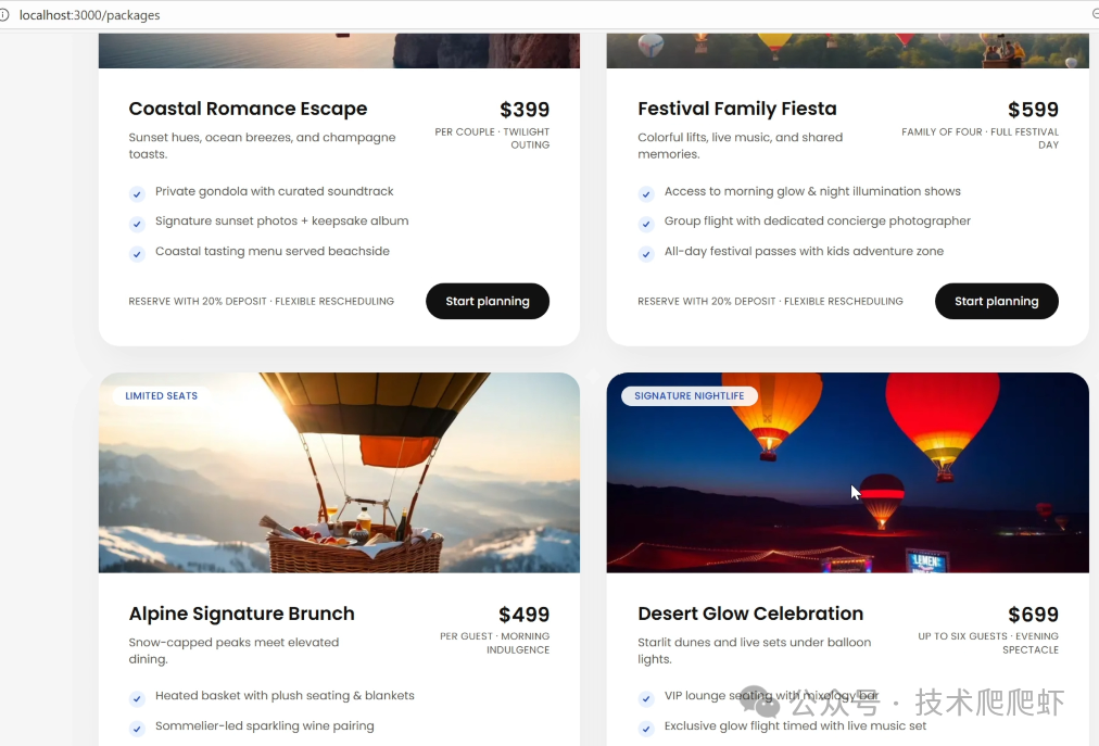 我让AI用MCP把这个项目部署到Vercel上面,这样就完成了部署。这里有一个预览地址,我们看一下,Vercel的这个域名只有在国外的上网环境才可以看到。https://hot-air-balloon-travel-ixqulcc39-tech-shrimps-projects.vercel.app/