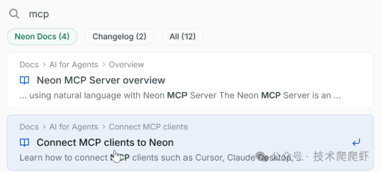 Neon是一个基于Postgres封装的免费的云端数据库。 https://neon.com 我们接入它的MCP,就可以让AI瞬间获得一个免费的云端数据库。这里找到Docs,然后搜索MCP,找到这个文档Connect MCP,里面列出了各个客户端的配置方式。