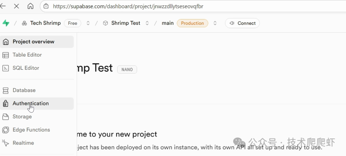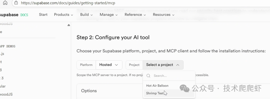 我们来把Supabase的MCP也配置一下。我们先来到Supabase的控制台,创建一个新的项目,给项目起个名字,填个密码,点击创建。我们来到Supabase的文档站,在project这里选择我们刚才建的项目。