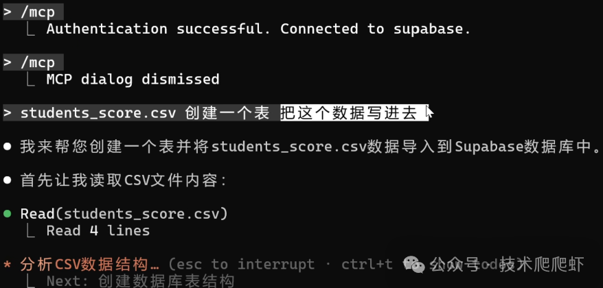 回车启动一下Claude Code,输入/mcp,选择Supabase,回车,在浏览器打开的窗口下面点击授权,这样就配置完成了。我还是让他创建一个表,把这个数据写进去,