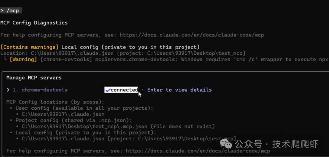 安装完成以后,我们启动一下Claude Code,然后输入这个命令/mcp,回车这里打上一个对勾,显示connected,就配置完成了。