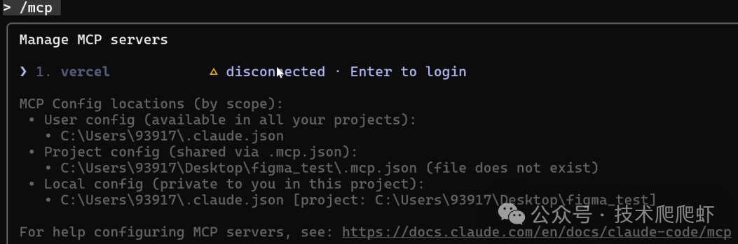 这里有Claude Code的配置方式,把这个配置命令复制一下,把命令粘贴过来回车。我们启动一下Claude Code,/mcp,这里Vercel的MCP需要先登录一下,