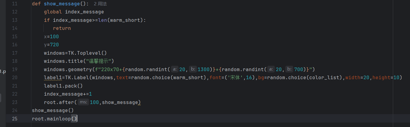 这个函数里用到了tkinter的after()方法当过了预定值后就会执行一段代码,after方法可以在指定的时间后执行一段代码,我们在after里放置了主函数,执行完主函数在反复执行主函数,执行以便就会在index_message赋值加一,当我们前面的if index_message>=len(warm_short):判断生成的窗口比warm_short值大也就会return,跳出函数,停止执行。