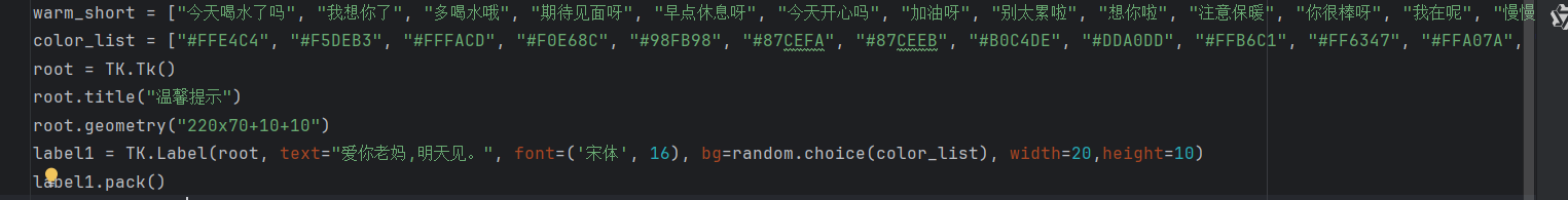 label1=TK.Label(windows,text=random.choice(warm_short),font=('宋体',16),bg=random.choice(color_list),width=20,height=10)