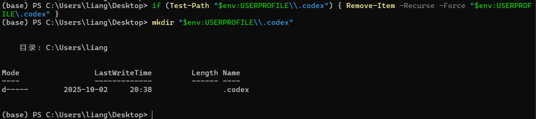 删除旧目录(若存在)if (Test-Path “KaTeX parse error: Expected '}', got 'EOF' at end of input: …ecurse -Force "env:USERPROFILE.codex” }# 创建新目录mkdir “$env:USERPROFILE\.codex”