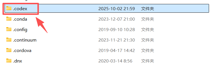 然后查看当前路径下是否存在 .codex 文件夹,如果存在就先删除,重新重新创建一个同名文件夹:.codex
