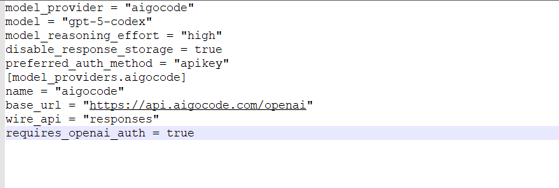 model_provider = "aigocode"model = "gpt-5-codex"model_reasoning_effort = "high"disable_response_storage = truepreferred_auth_method = “apikey”[model_providers.aigocode]name = "aigocode"base_url = "https://api.aigocode.com/openai"wire_api = "responses"requires_openai_auth = true