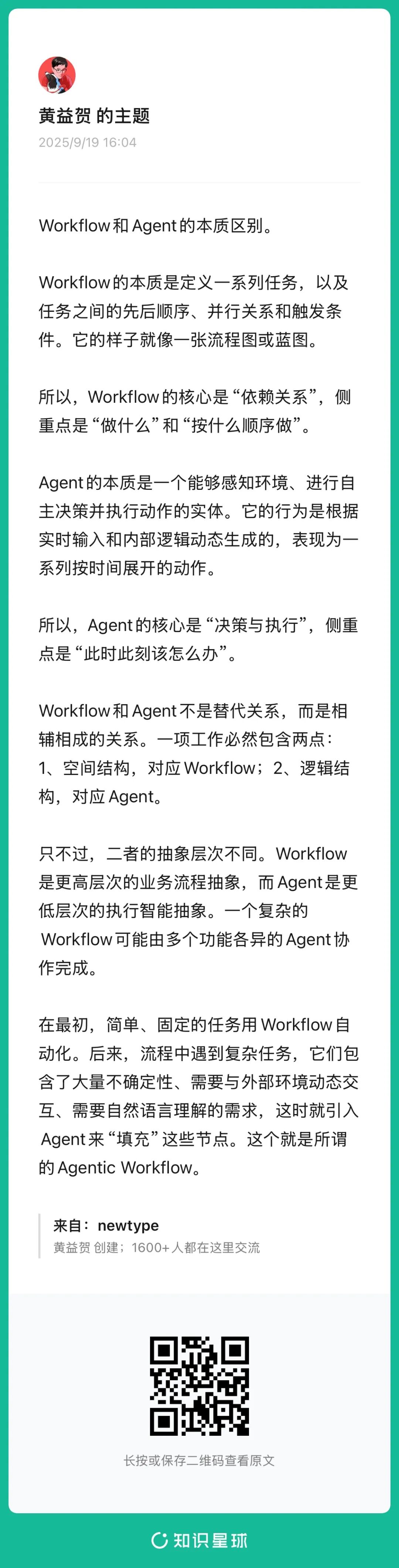 Workflow和Agent不是替代关系,而是相辅相成的关系。一项工作必然包含两点:1、空间结构,对应Workflow;2、逻辑结构,对应Agent。