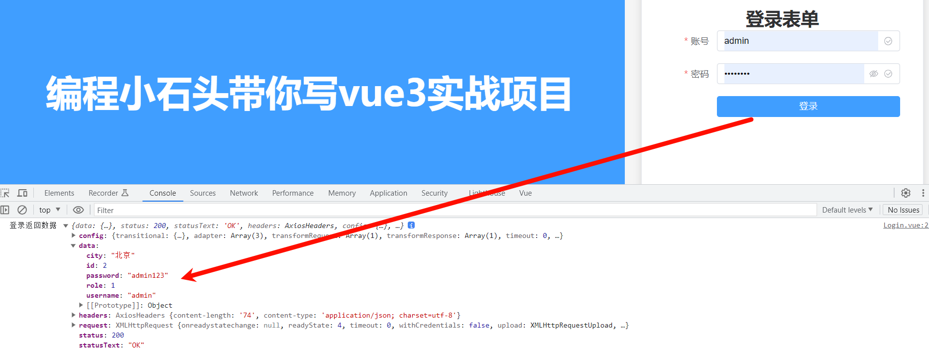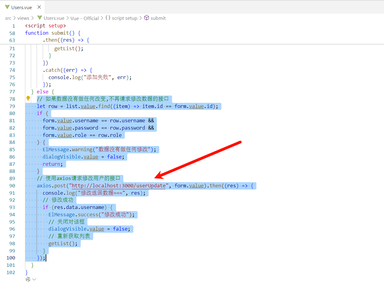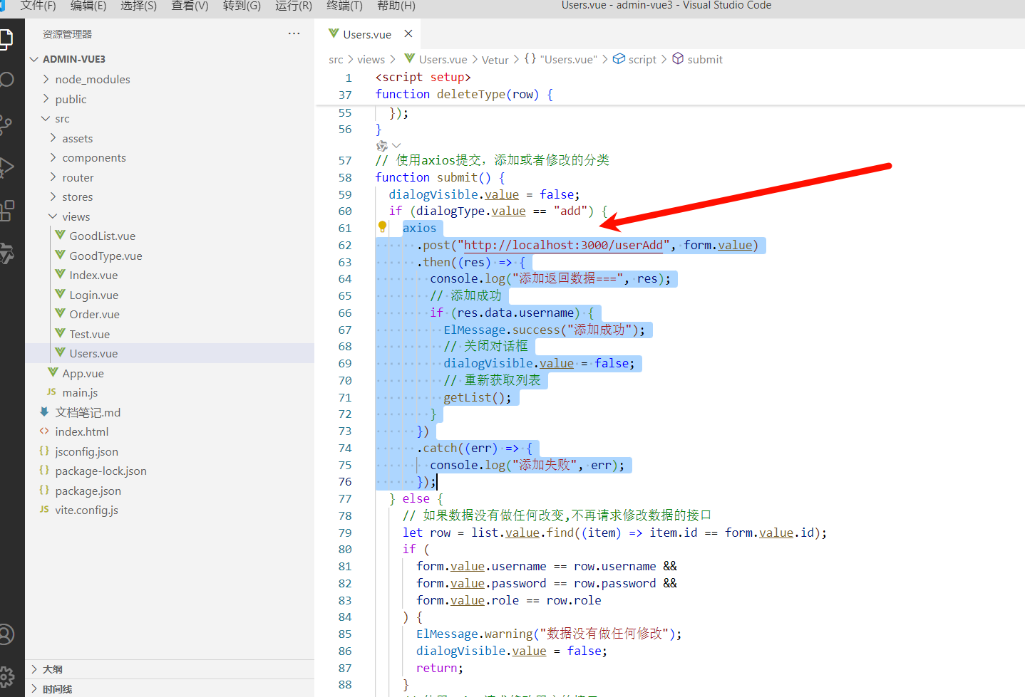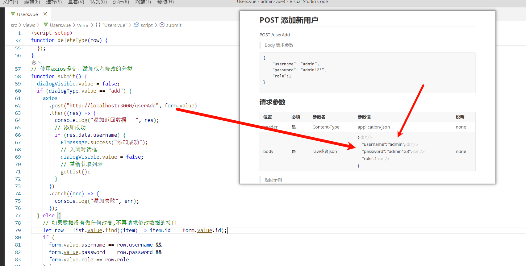 我们需要传入的参数有用户名和密码。项目里使用axios做post请求代码如下