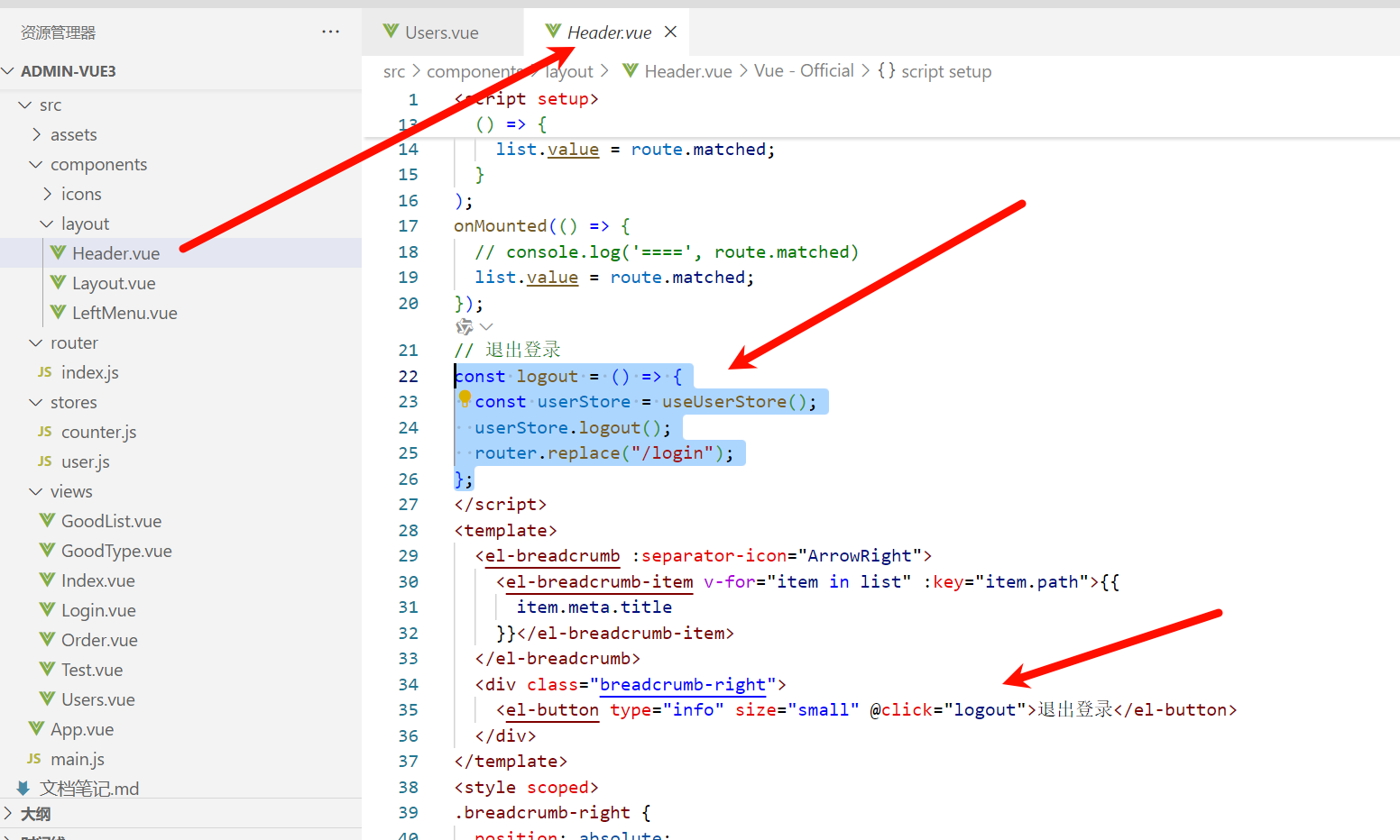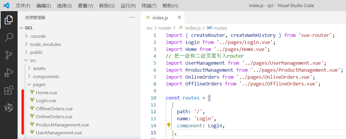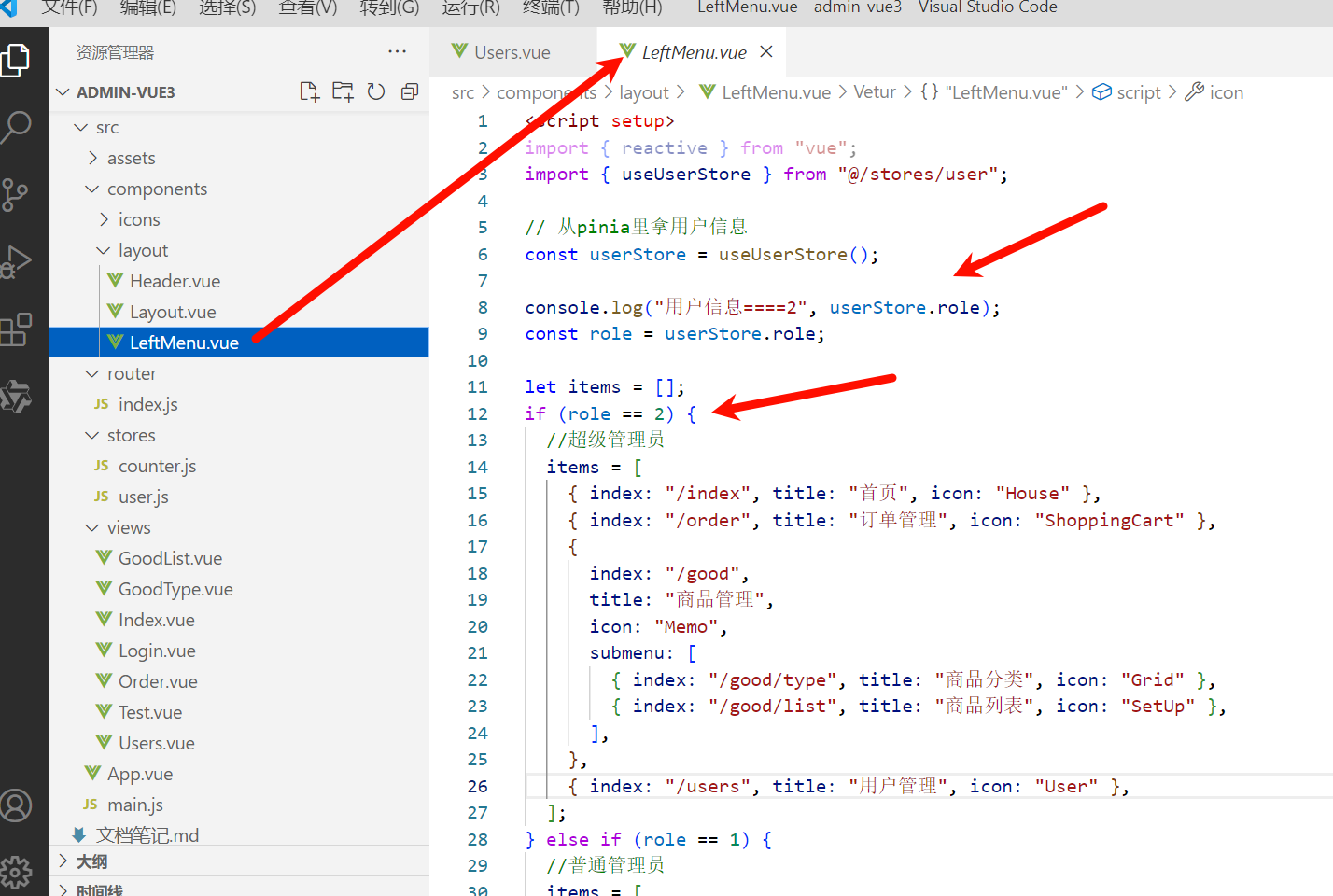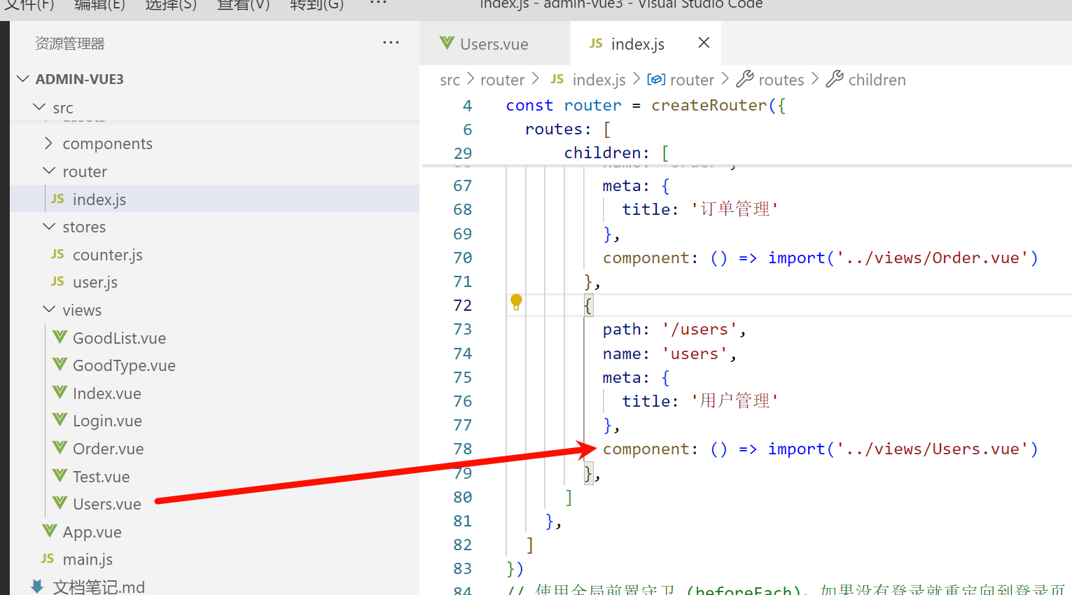 那么我们就来实现这个用户管理页。首先要创建Users.vue页面,然后在router里注册路由。