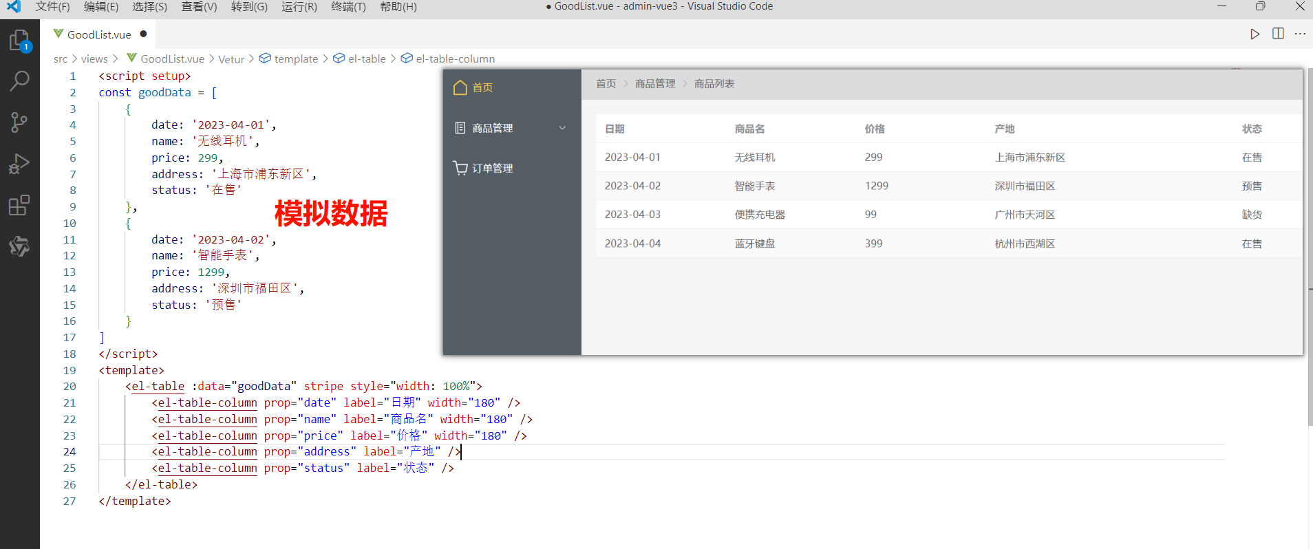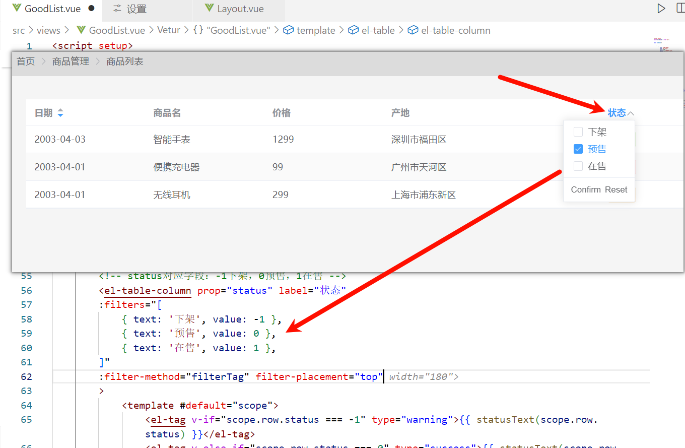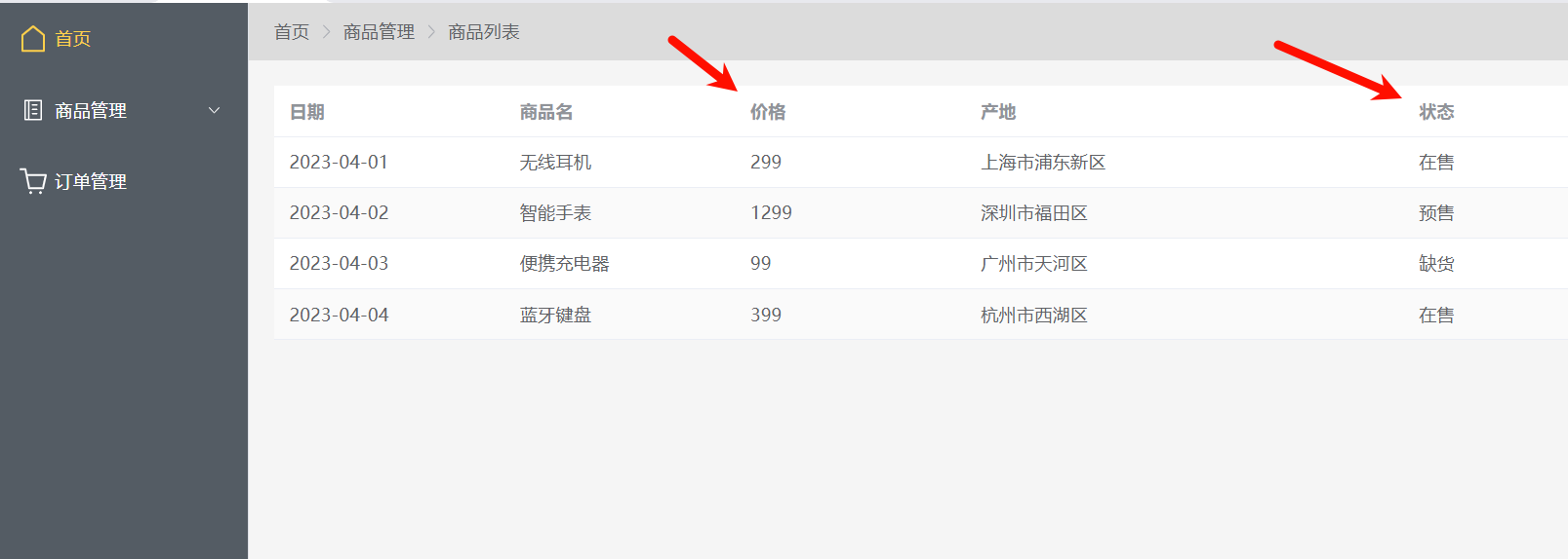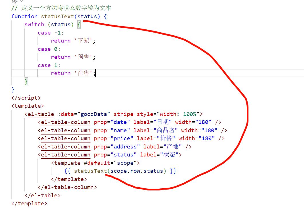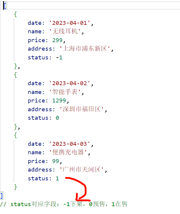 通常后台给我们返回的商品数据是这样的商品状态后台不直接给我们返回文本,而是数字,不同数字代表不同状态。我们如果直接显示,会把数字显示出来,这样肯定是不友好的。所以我们要把数字转换为对应的状态文本。就定义一个函数。来实现转换即可。下面是函数定义和使用。显示效果如下。