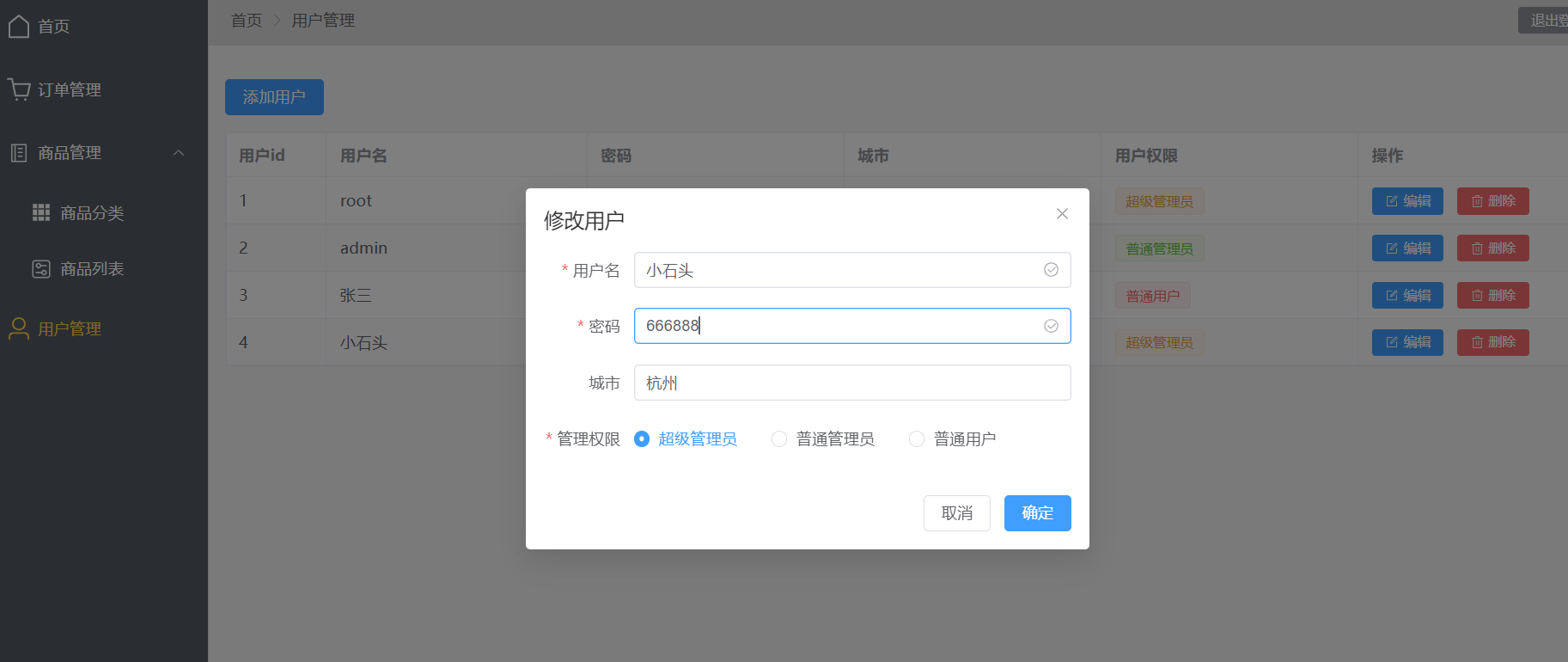如超级管理员可以管理所有功能,可以修改用户信息