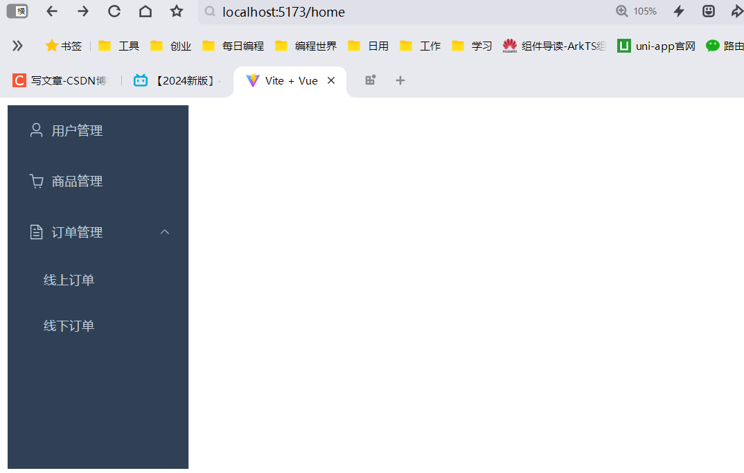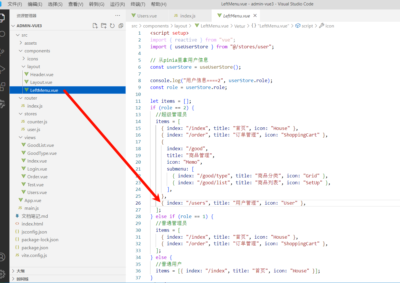 然后去到首页左侧导航栏,在超级管理员登录成功后,加载这个用户管理导航菜单。普通管理员和普通用户不加载。