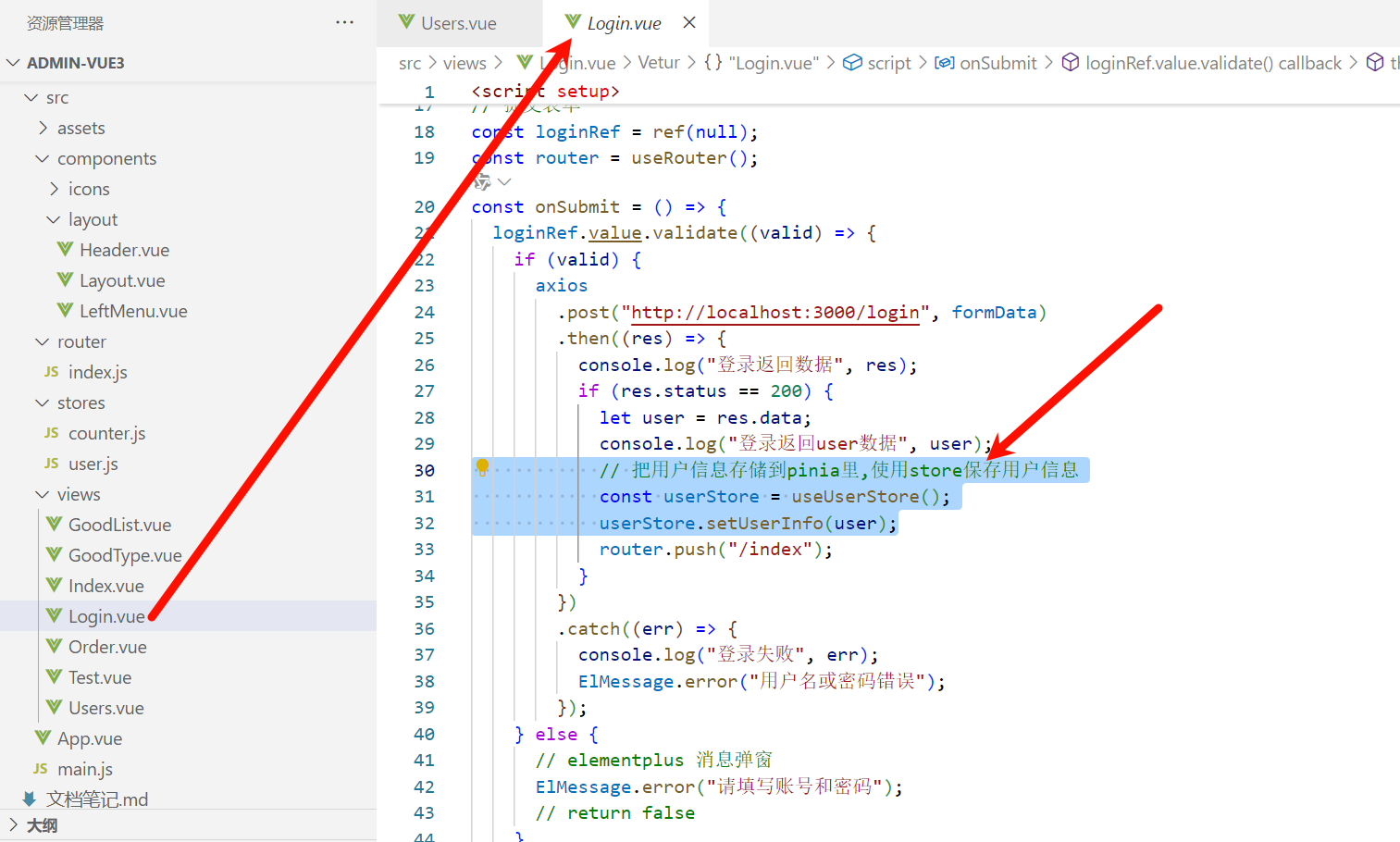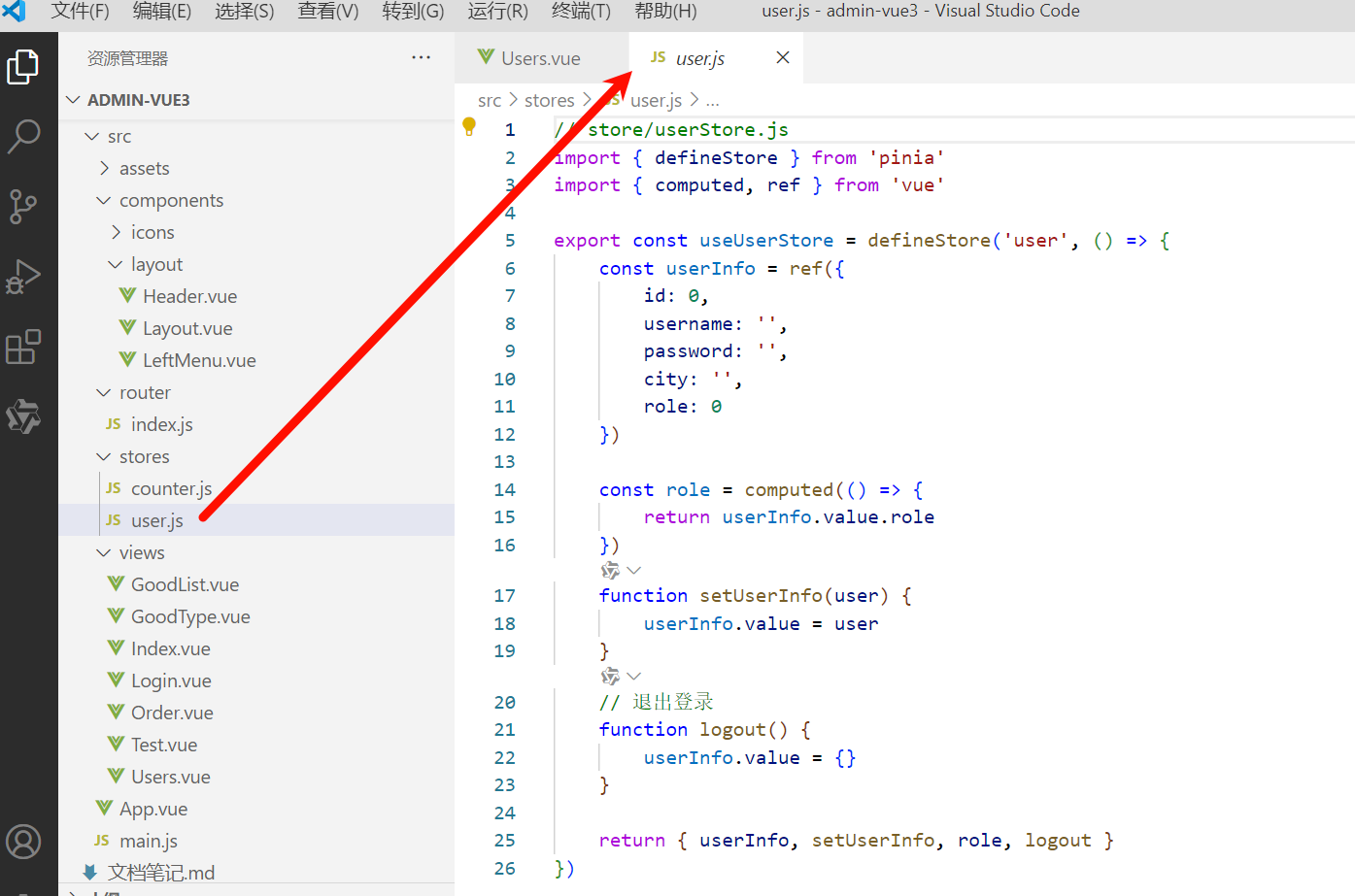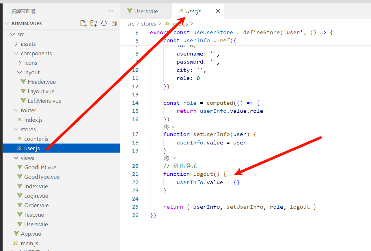 不知道pinia是什么的同学可以去看下我们零基础入门vue3,我们这里直接就使用pina来存储登录成功后的用户信息了。包括我们后面做的退出登录,在退出登录的时候要清空下pinia里存的数据的。