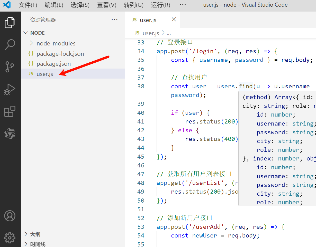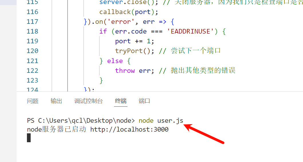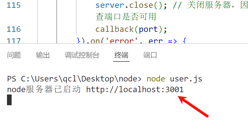 我们用户相关的所有接口,都是定义在user.js里,所以我们打开终端执行node user.js