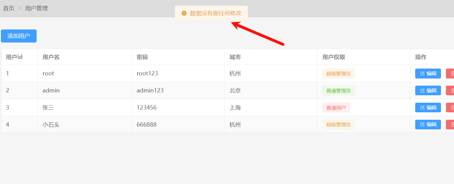 如果我们提交的新信息和老信息没有任何区别,会提示用户 数据没有做任何修改。