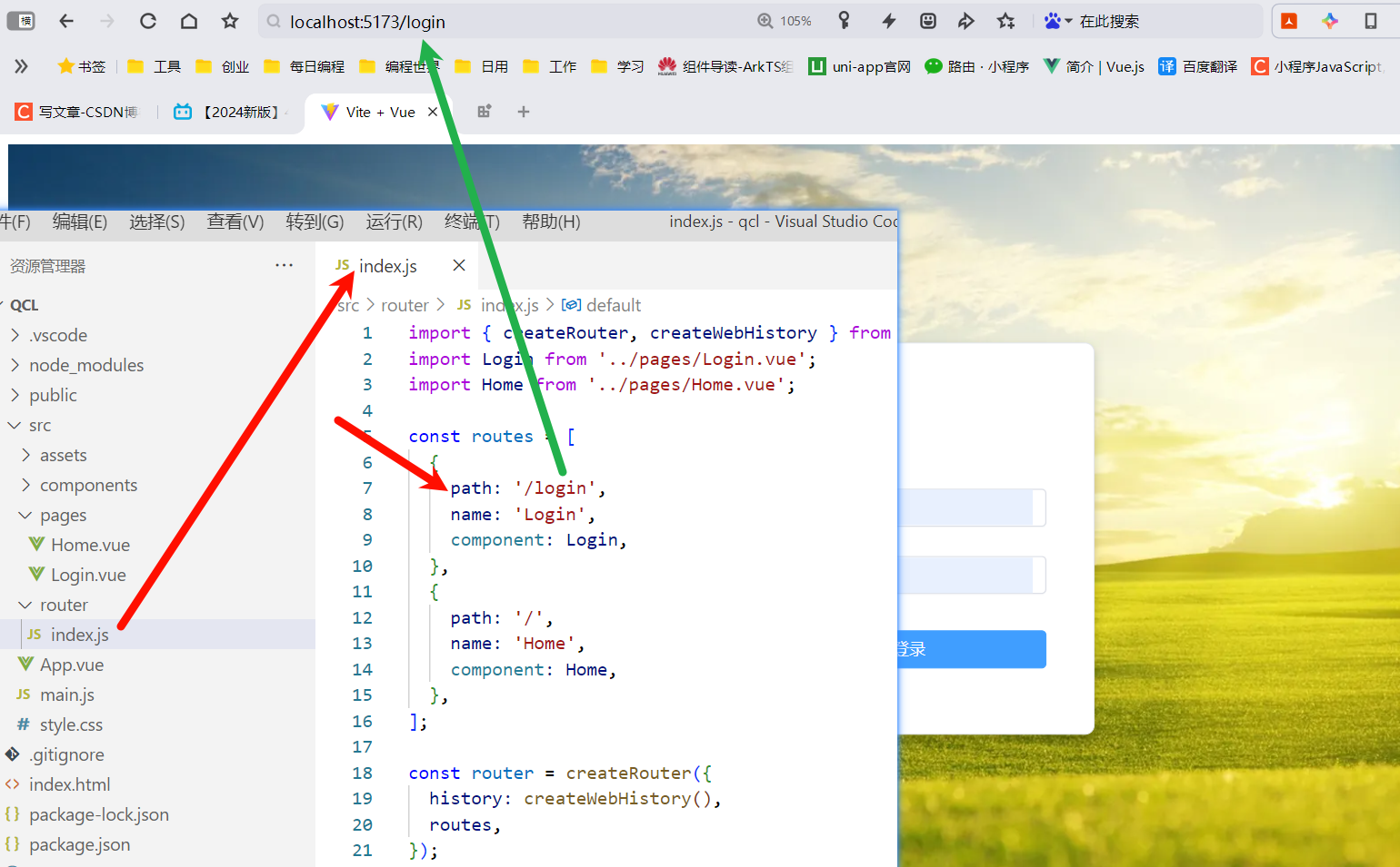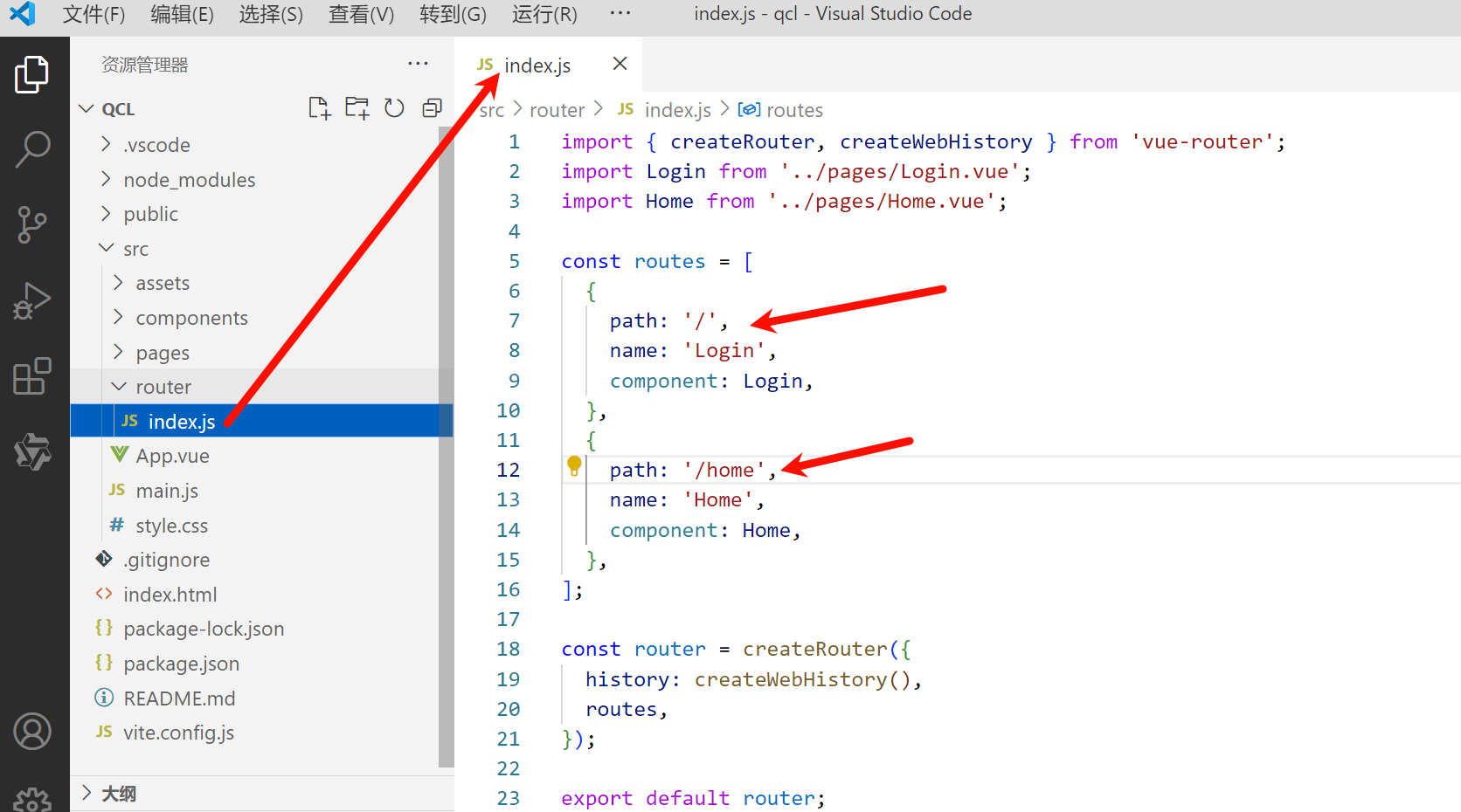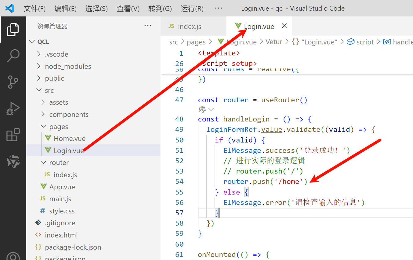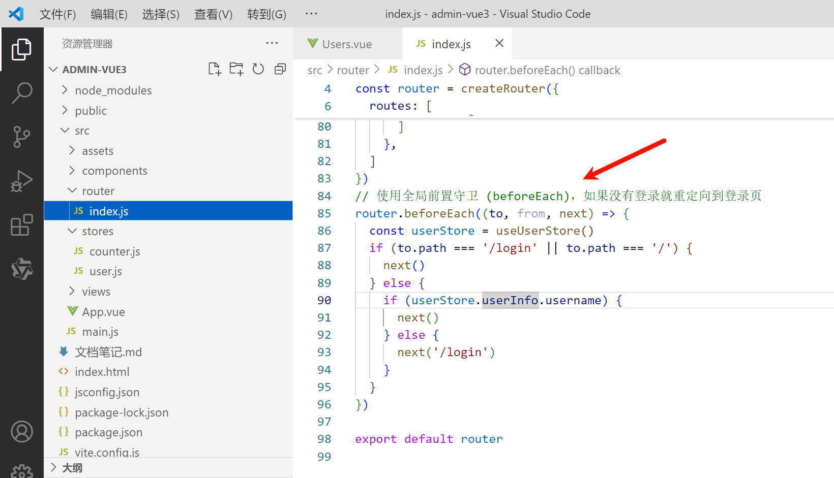 所以我们要做下路由的全局前置守卫。就是在退出登录后,不管用户进入到那个页面,都要先检查下登录状态的,如果没有再次登录,就强制跳转回登录页。只需要在router目录的index.js里加入如下代码即可。